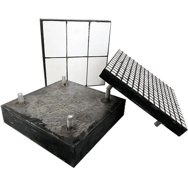 即陶瓷和橡膠二合一板,將特殊的陶瓷片通過硫化工藝嵌入特種橡膠內(nèi),形成方形的耐磨橡膠陶瓷復(fù)合體,然后通過焊接或粘貼固定在設(shè)備的內(nèi)殼鋼板上,以形成堅固而緩沖的耐磨層。